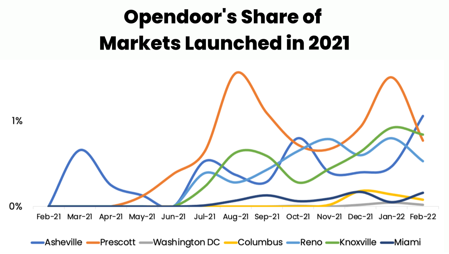 Above are the smallest markets Opendoor launched in 2021. Collectively, they represent only 0.9% of all Opendoor Q2 home sales, and mean February marketshare is only 0.49%.