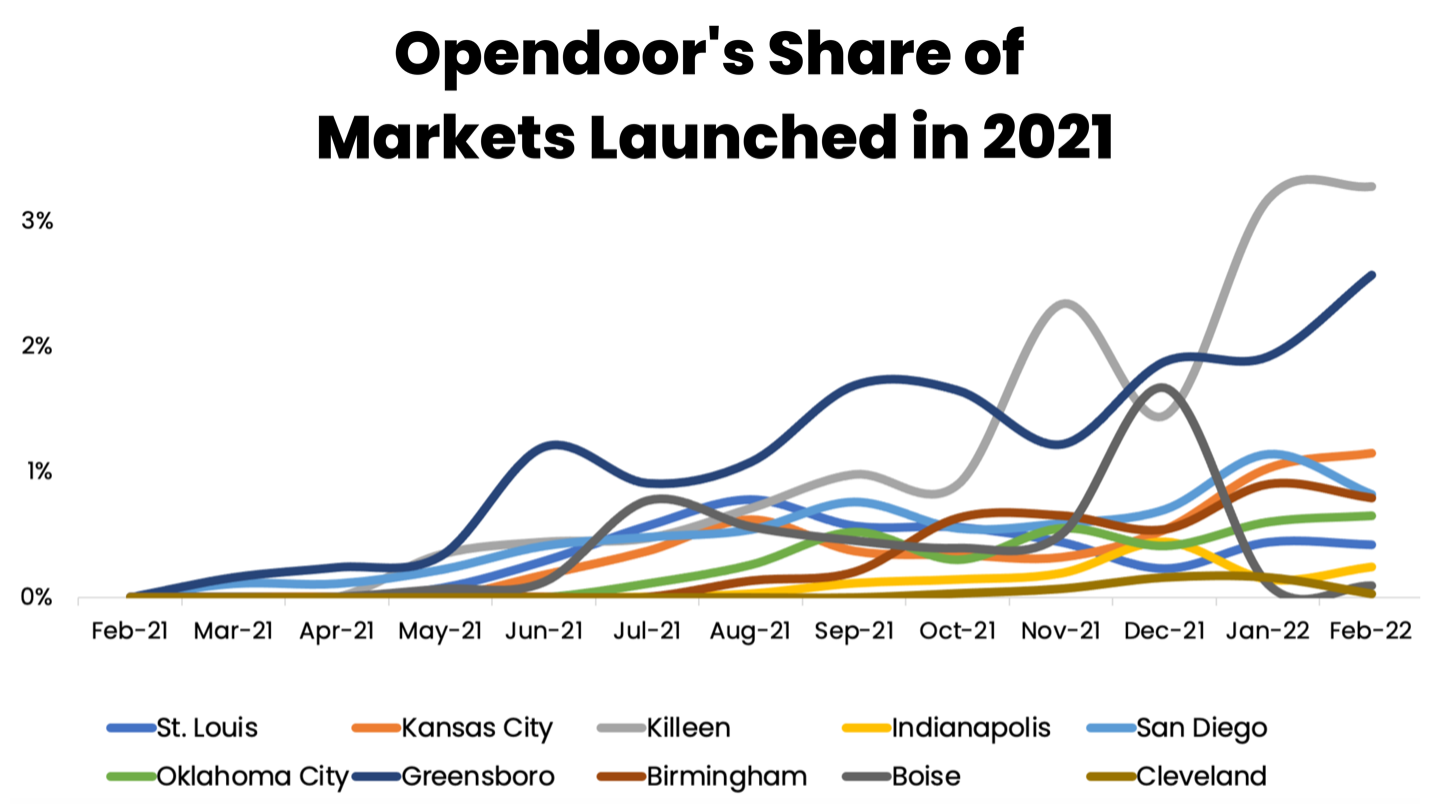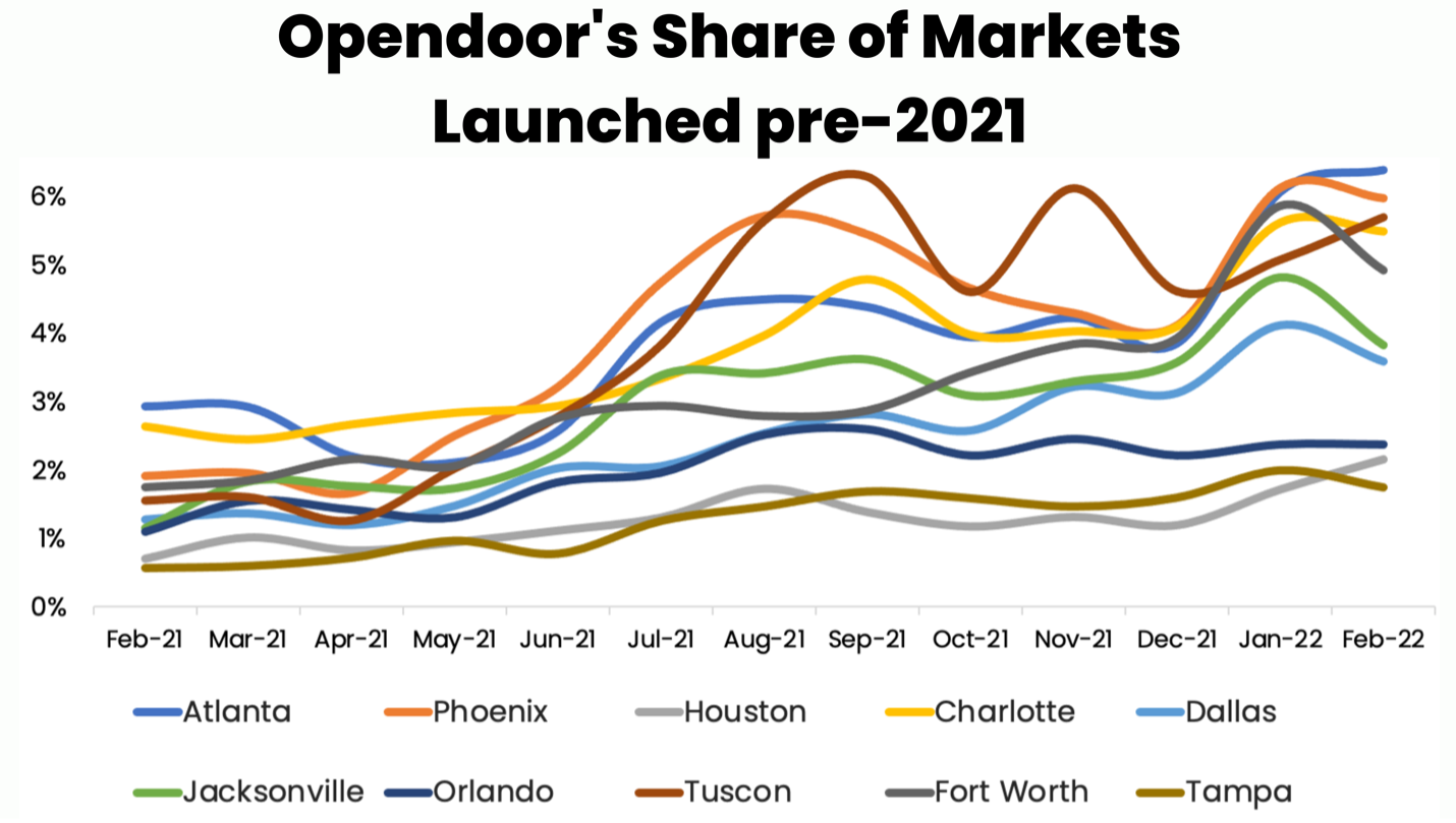 Above are Opendoor’s ten largest markets launched in 2021. As of February 2022, mean marketshare across these geographies is 1%. As these markets have averaged only 6 months of operation each, marketshare growth here is superior to prior cohorts.