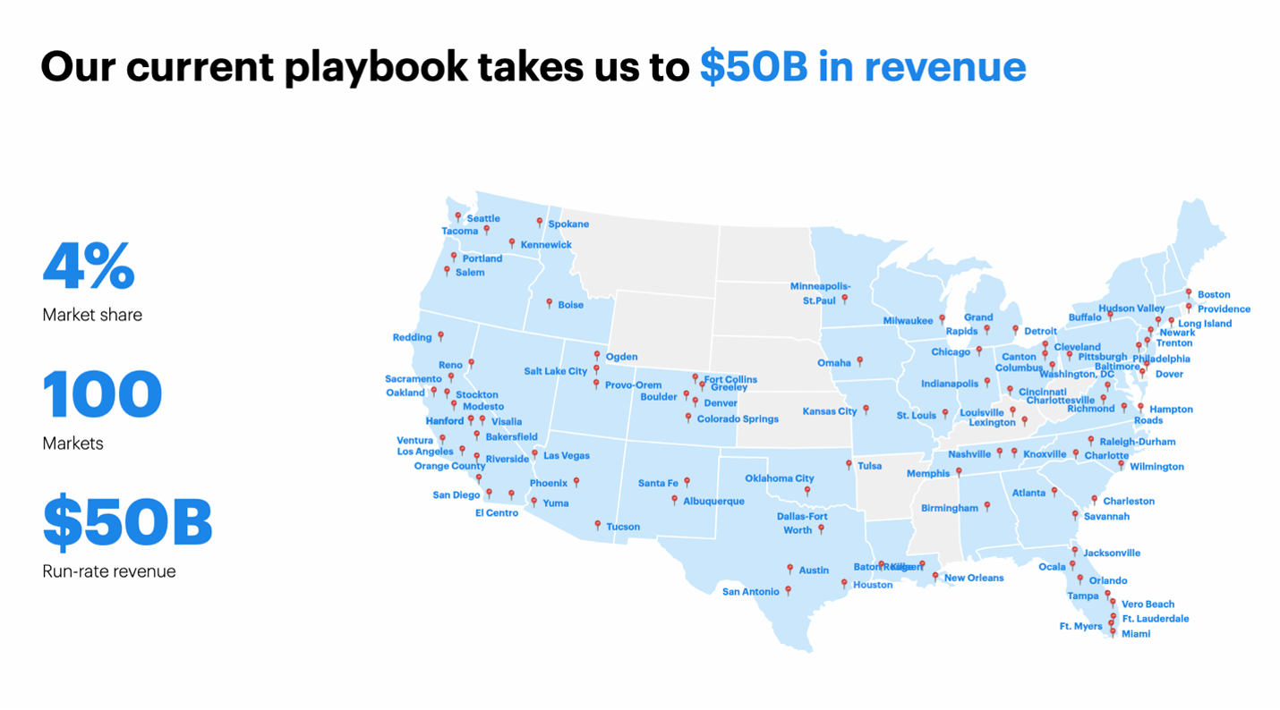 In September 2020, Opendoor released its first public investor presentation. Management laid out an audacious goal to one day operate in 100 markets, claiming 4% share of all U.S. residential real estate transactions.
