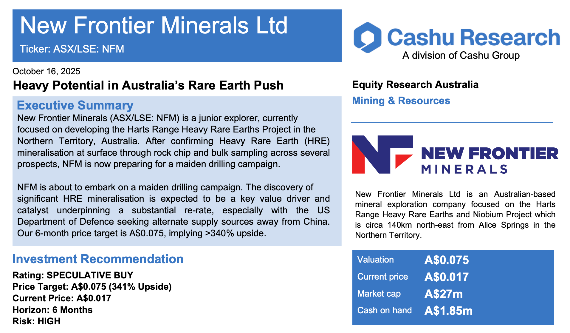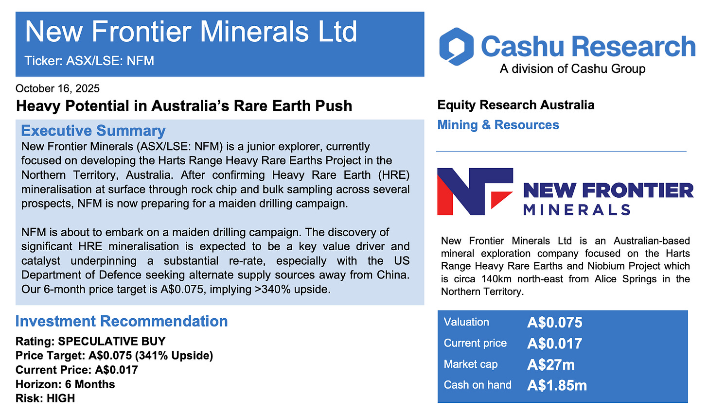 We first covered New Frontier Minerals Ltd in our launch research note while it was trading at A$0.017. Today it’s up to A$0.021—an early move that’s gaining momentum ahead of its maiden drill campaign.