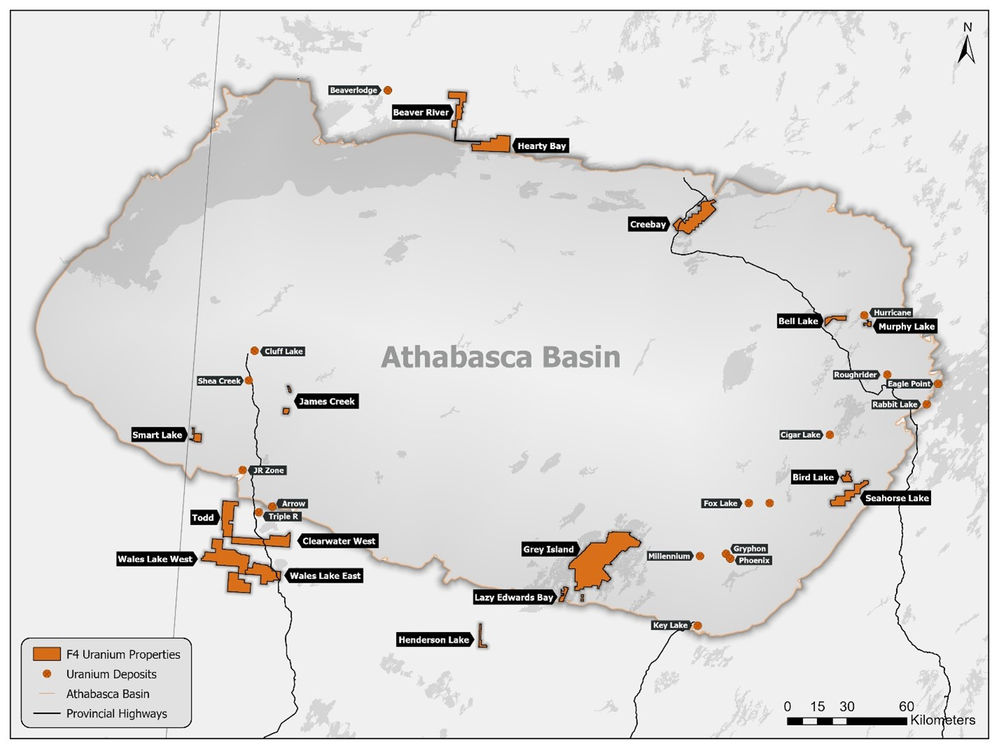 F4 holds approximately 16 uranium exploration projects across the Athabasca Basin, including Murphy Lake, Todd Lake, Wales Lake, Grey Island, Clearwater West, and more.