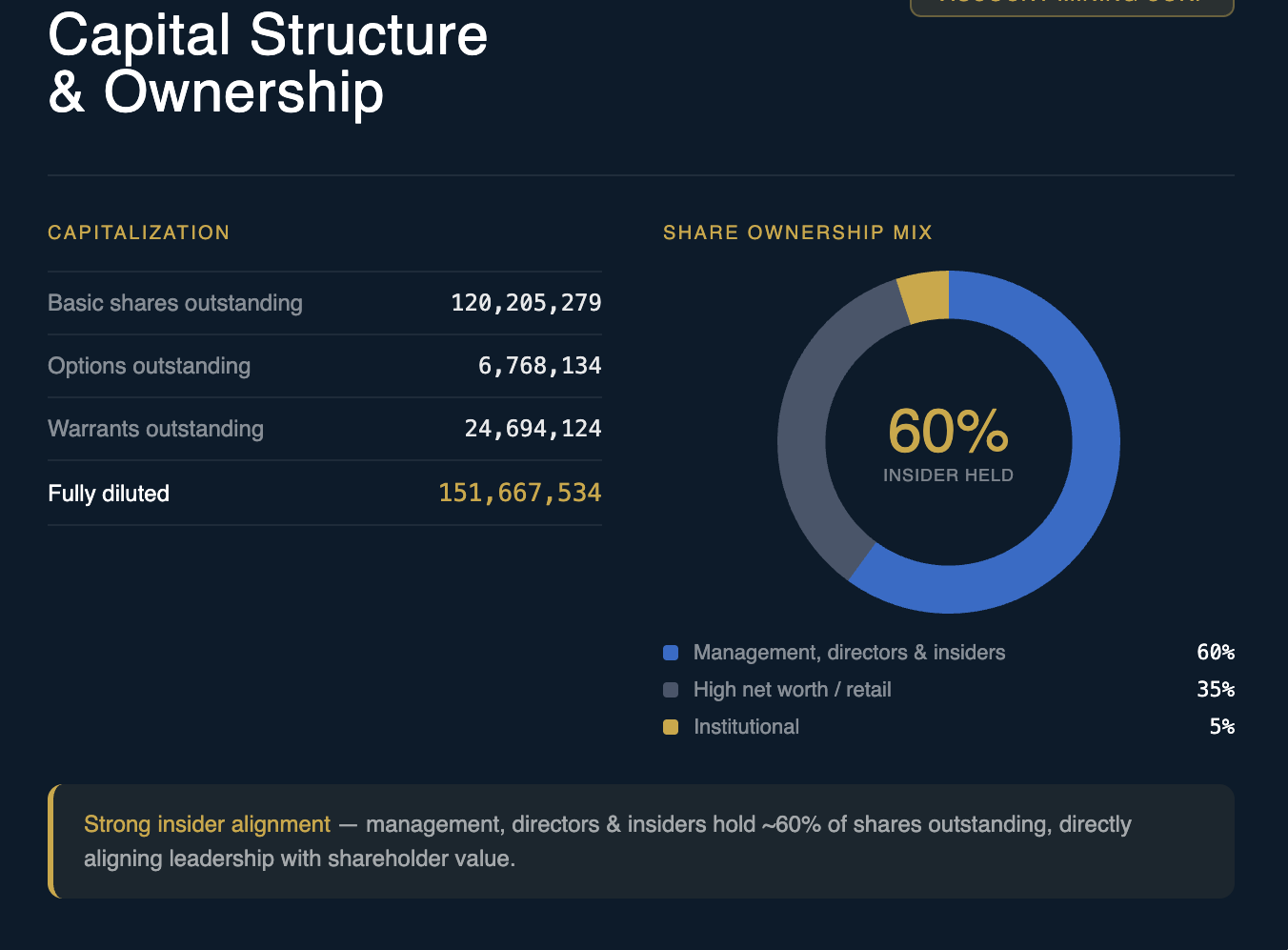 Insiders and close holders own approximately 60% of Viscount’s shares. That’s a level of alignment you rarely see in junior mining. When the people running the company and their inner circle have that much of their own money tied up in the stock, their incentives are directly aligned with outside shareholders.