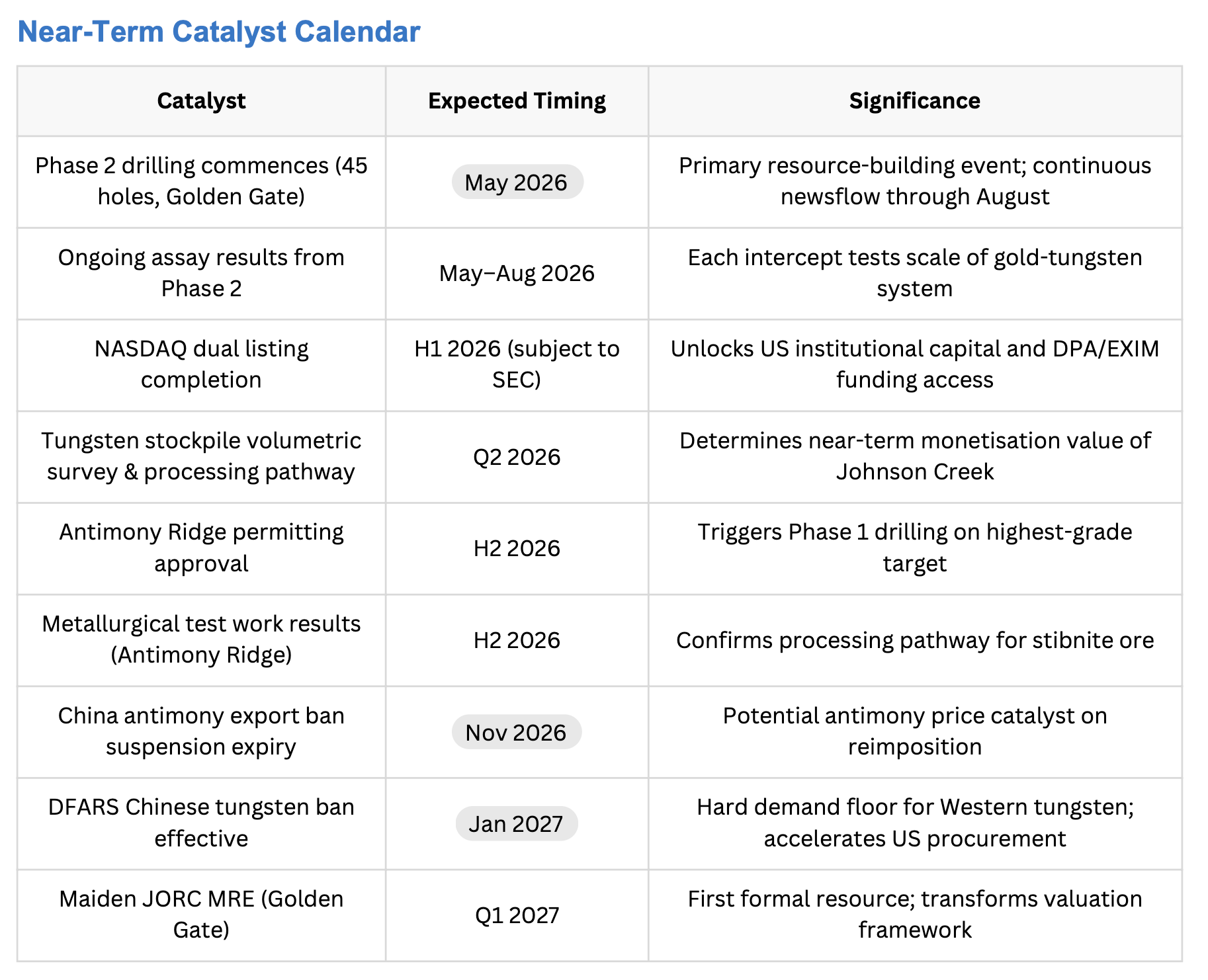 Gold. Phase 1 drilling at Golden Gate returned broad near-surface gold in every single hole, including 253m @ 1.5 g/t Au from surface. A 45-hole, 13,700m Phase 2 program kicks off in May 2026.